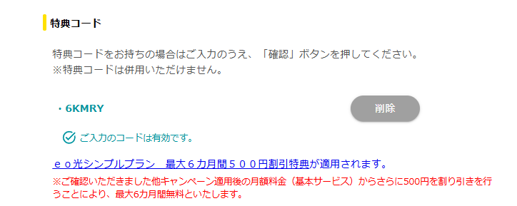 | 適用条件 | ・キャンペーン期間中にeo光シンプルプランを新規申し込み ・お申し込み日の属する月の6ヶ月後の月末までにご利用を開始された方 |