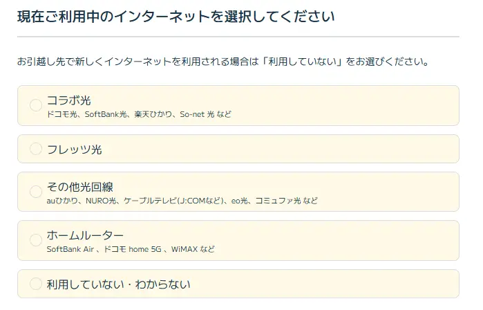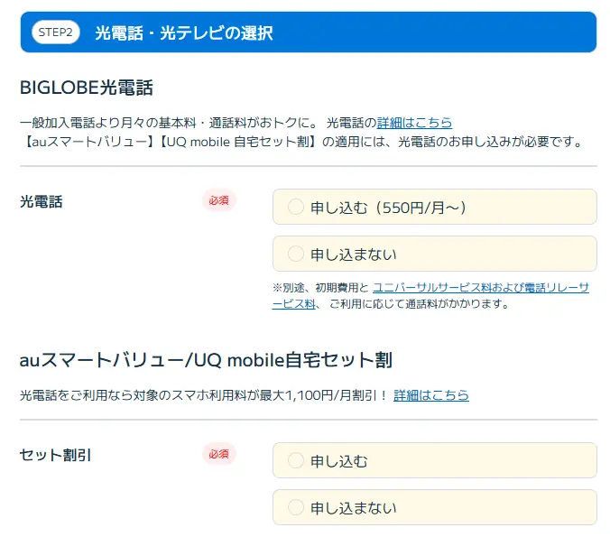 続いて、「光電話」「スマホセット割」「光テレビ」「無線Wi-Fiルーター」などのオプションを申し込むか選択します。