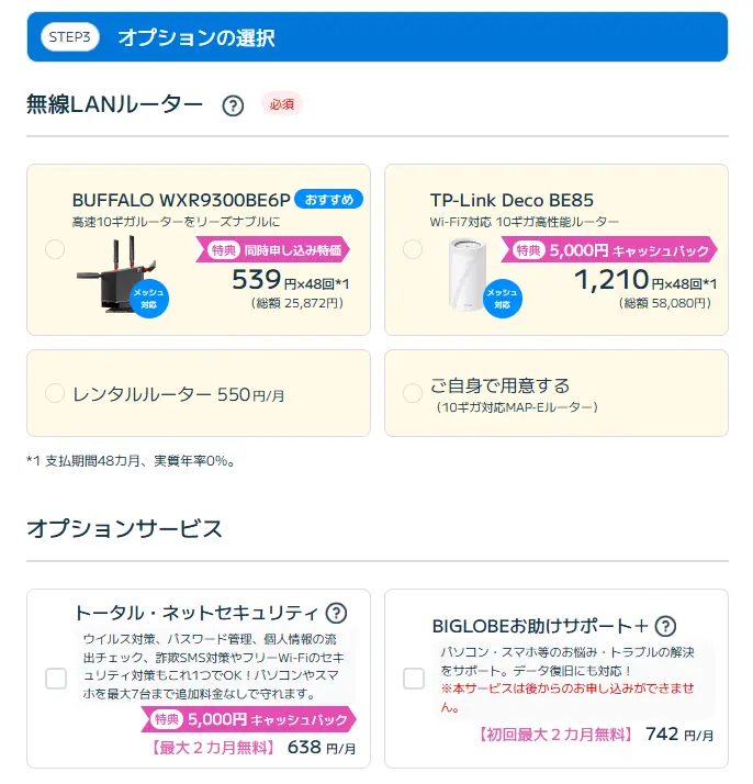 | オプション | Wi-Fiルーター | Deco BE85 5,000円 | Deco X50 15,840円 |