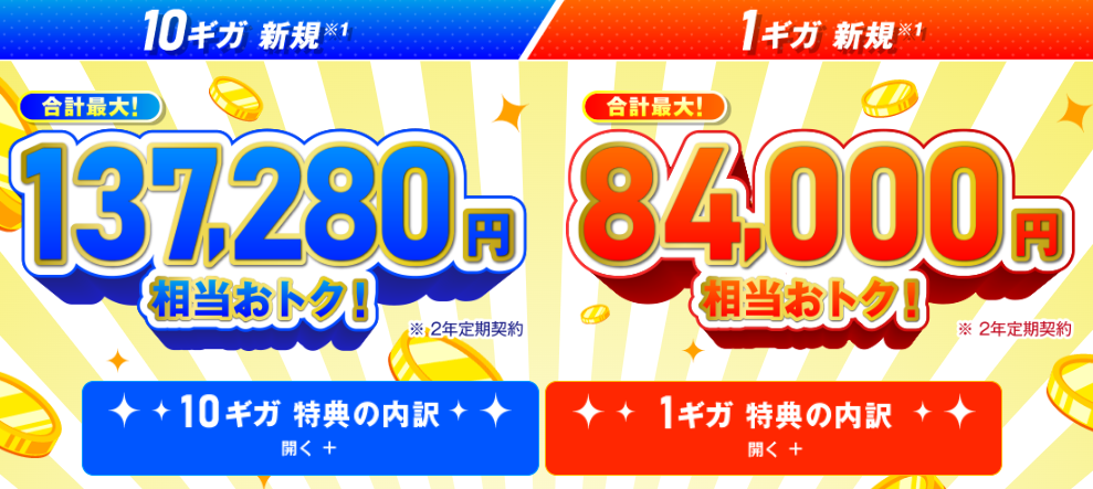 | キャッシュバック | 126,000円 ※事業者変更/転用は105,000円 (11ヶ月後/23ヶ月後) ↑今なら最大96,000円増額中!! ↑今なら最大96,000円増額中!! | 83,000円 ※マンションは64,000円 (11ヶ月後/23ヶ月後) ↑今なら最大53,000円増額中!! ↑今なら最大53,000円増額中!! |