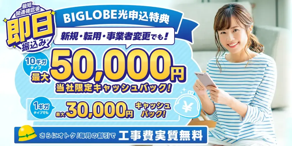 結論、ビッグローブ光の代理店である「アウンカンパニー」は、最大50,000円のキャッシュバックが貰える代理店でした。