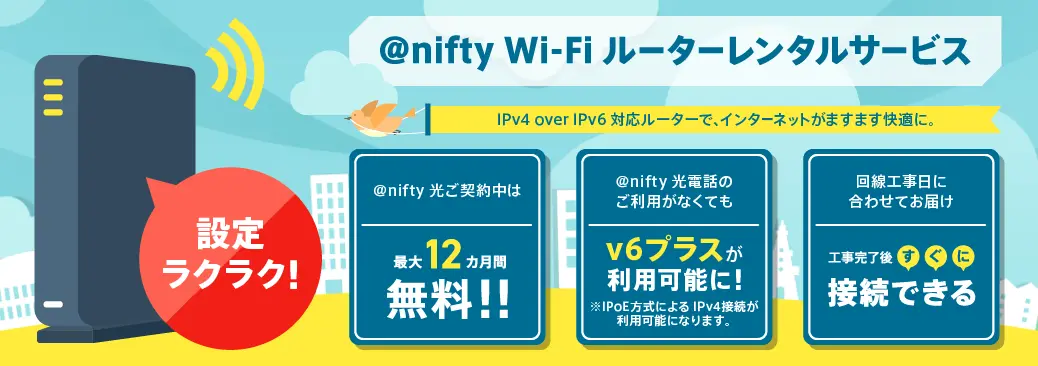 nifty光では、1ギガWi-Fiルーターなら最大12ヵ月無料で利用できます。