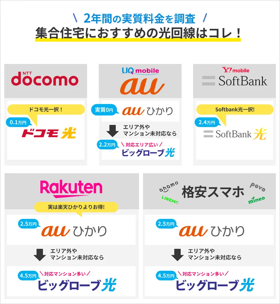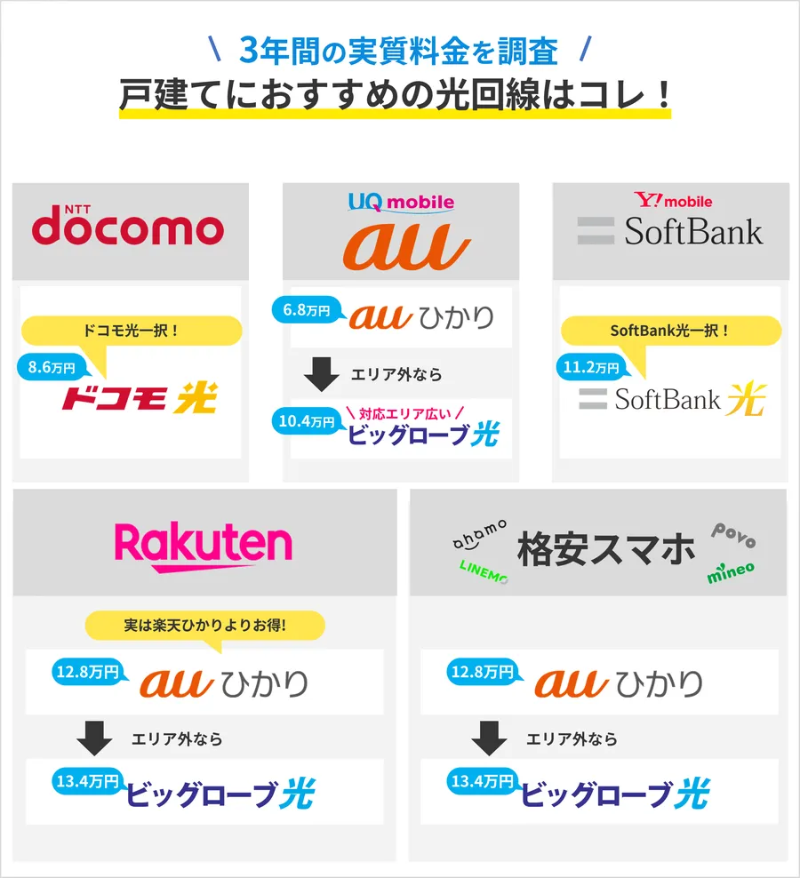 まずは自分の居住地に対応した独自回線を第一候補にし、もしそれが使えない場合(マンションなど)に「ドコモ光」や「ソフトバンク光」などのコラボ光を選ぶのが鉄則です。