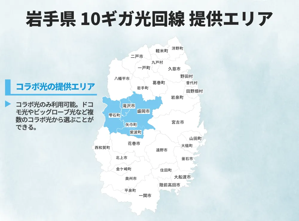 そのため、岩手県で10ギガ光回線を利用したい場合は、光コラボ系(ドコモ光・ソフトバンク光・GMOとくとくBB光など)から選ぶ必要があります。