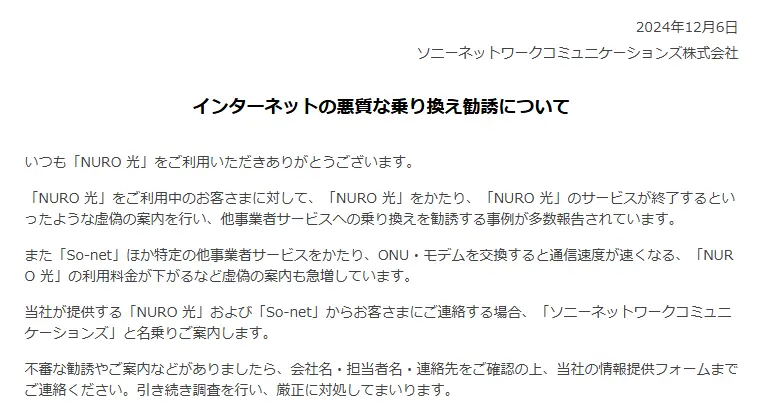 実際に、NURO公式も「悪質な勧誘」に対して注意喚起を行っています。