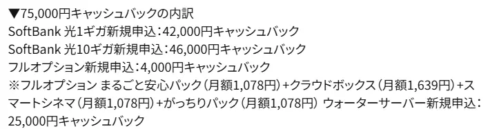 例えば、ソフトバンク光の代理店「エフプレイン」(2026年1月調査時点)では、75,000円のキャッシュバックをもらうためには「ウォーターサーバー」と「まるごと安心パック」など複数のオプションに加入する必要があります。