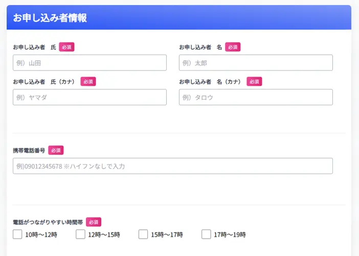 画面の指示に従い、契約者情報、設置場所住所、希望プラン、連絡先などを入力します。
