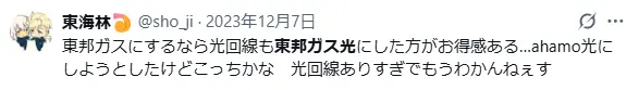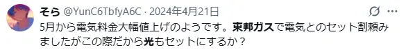 電気料金の値上げをきっかけに、光回線も東邦ガス光にまとめてセット割を適用させようかと検討している声も見られました。