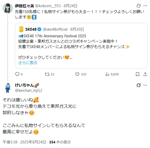 東邦ガス光は、地元名古屋を拠点とするアイドルグループ「SKE48」とのコラボキャンペーンを実施しており、これが契約の決め手になったという声もありました。