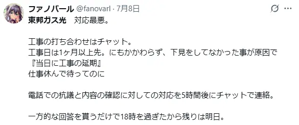 工事日が決まっていたにも関わらず、当日に延期となり、その後の対応にも不満を感じているようです。