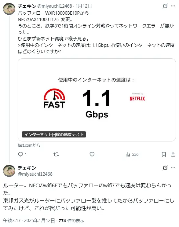特にオンラインゲーム(鉄拳8)でネットワークエラーが発生していたが、NEC製ルーターに変更したら改善した、という具体的な声がありました。